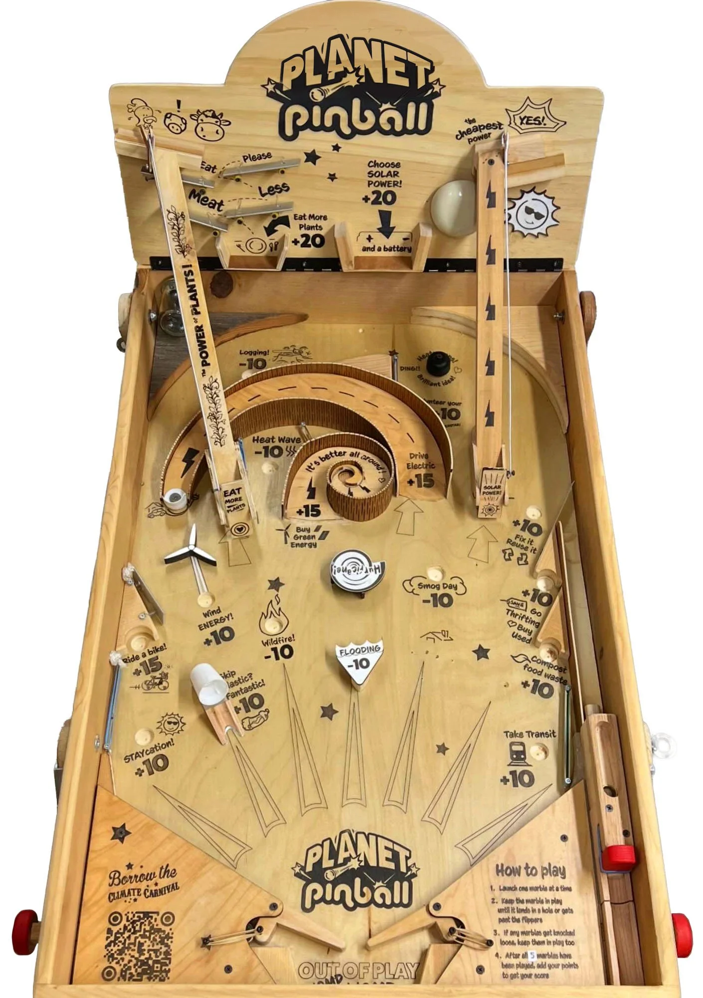 Old school pinball fun is back - and it’s cordless! Play 5 balls for the high score with 18 targets ranging from ‘Eat less meat’, ‘Buy used’, ‘Ride a bike’, to ‘Skip Plastic, Fantastic!’. Don’t get caught in ‘Deforestation’, ‘Flooding’ or ‘WIldfires’ though, they subtract points! Clever contraptions abound on this wooden wonder with jumps, bells and ramps.